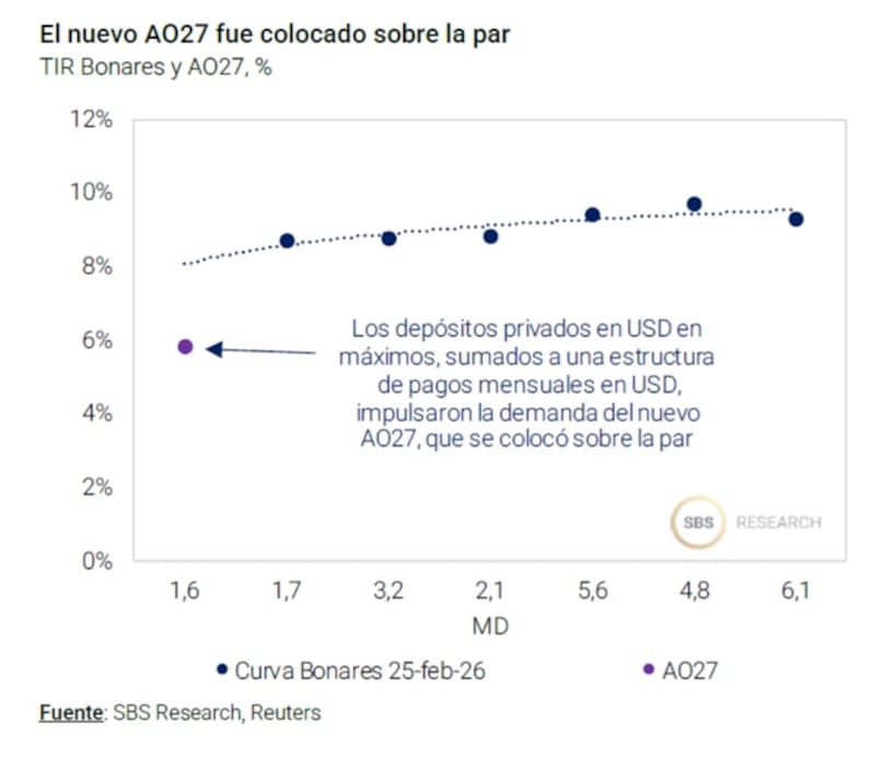 “La combinación entre flujo de fondos, tasa y duration corta le otorga ventajas relativas frente a otros instrumentos de la curva soberana, así como frente a corporativos y títulos del BCRA. El A027 vence el 29 de octubre de 2027; si bien es posterior a las elecciones presidenciales, se encuentra dentro del mandato de Milei y antes de un eventual ballotage, lo que limita la incertidumbre política relativa frente a títulos de mayor plazo”, dijeron desde Cohen.