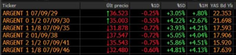 "En lo que va de la semana, los globales acumulan alzas de entre 3,5% y 6,2%. ¿Qué títulos se destacaron? La mejor performance fue para los Old Indenture (38s & 41s) avanzado 5,2% y 6,2%, respectivamente. La preferencia por los 38s & 41s tiene que ver con su mayor tasa corriente en los primeros años", agregaron los analistas de PPI en el mencionado informe.