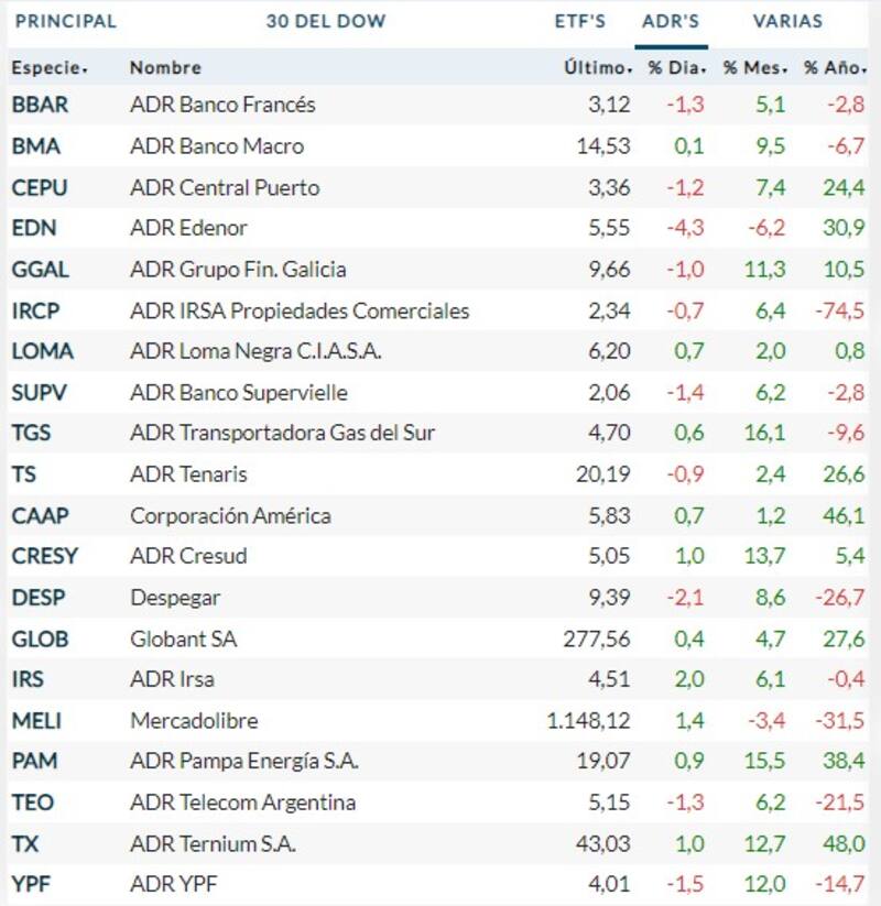 Pese a que los índices de referencia de Estados Unidos avanzan en el cierre de la semana, con el Dow Jones y el S&P 500 creciendo 0,3% y 0,58% respectivamente, y el tecnológico Nasdaq avanzando 0,55%, las acciones locales no logran contagiarse. Los ADR argentinos operan en ambos sentidos y el S&P Merval de la Bolsa porteña cae 1,14%, hasta los 85.557 puntos.
