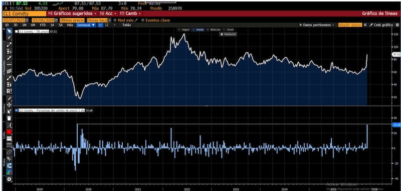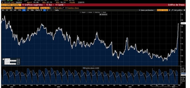 El petróleo comenzó su fuerte repunte después de que Estados Unidos e Israel lanzaran ataques contra Irán el sábado, lo que llevó a Teherán a detener el paso de petroleros por el Estrecho de Ormuz.