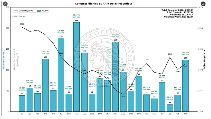 Ayer el BCRA compró u$s 124 millones, es decir, el 35% del volumen del MLC mientras que en el mes de marzo ya lleva comprado u$s 251 millones.
