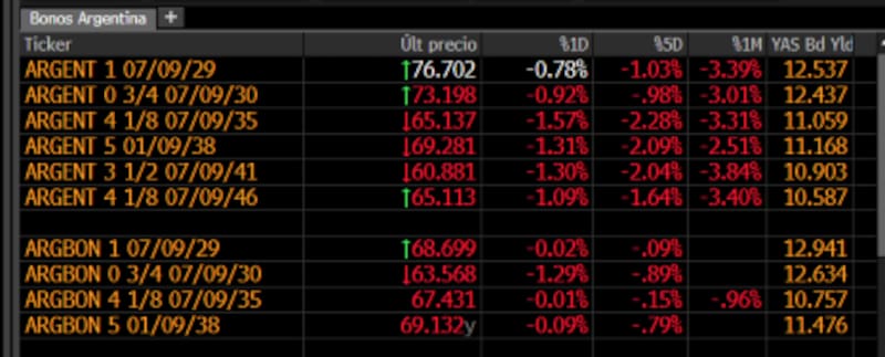 Los bonos del tramo corto caen cerca de 8% desde sus máximos, mientras que la parte media de la curva acumula bajas de 6% para el GD35 y 4,8% en el GD38.