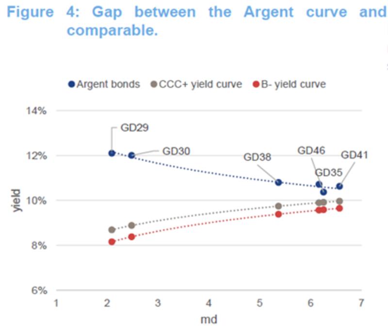 "Previo al pago de cupones, el mercado descontaba baja probabilidad de default hasta 2026 (5 pagos en ese momento) ahora el horizonte se mantiene, sólo que quedan 4 pagos en vez de 5 dentro del mismo período. Esperaríamos que, con la eliminación del blend y el acuerdo con el FMI, el mercado espere alta probabilidad de pago para un horizonte más largo que previo al pago de cupones, lo cual beneficiaría a la parte corta de la curva", explicaron.