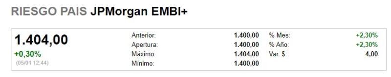 En línea con la debilidad de los bonos, el riesgo país se volvía a ubicarse por encima de los 1400 puntos. De esta manera, el indicador opera un 29% por encima de los valores alcanzados tras la reestructuración de la deuda en septiembre pasado, cuando el riesgo país llegó a tocar los 1083 puntos post canje.