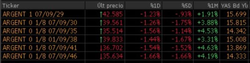 A contramano de estas leves mejoras en Nueva York, todos los tramos de la curva de bonos en dólares de ley extranjera operan con tendencia negativa. Los bonos más cortos, a 2029 y 2030, caen 1,23% y 1,26% respectivamente. En la parte media de la curva, el Global 2035 retrocede 1,56% y el Global 2038 pierde 1,44%, mientras que en el extremo más largo, los bonos a 2041 y 2046 exhiben bajas respectivas de 1,54% y 1,66%.