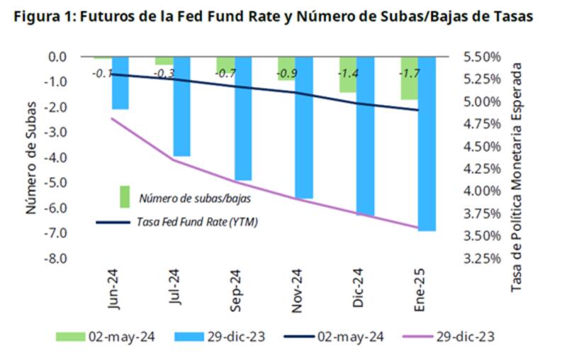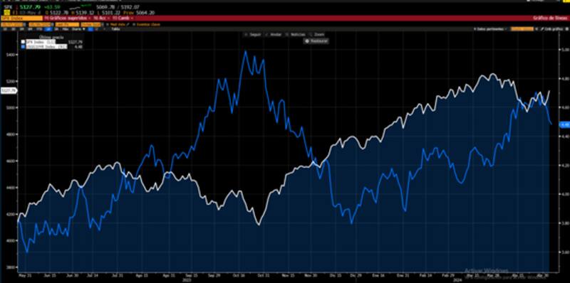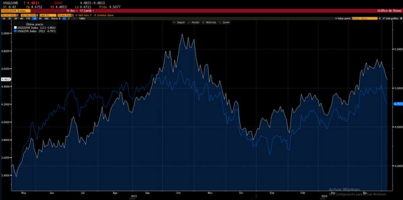 "A principios de año, el mercado descontaba que en 2024 íbamos a tener entre seis y siete bajas de tasas. Sin embargo, las sorpresas inflacionarias al alza obligaron al mercado a recalibrar sus expectativas, y hoy descuenta entre una y dos bajas de tasas para el presente año. Este reajuste en las expectativas tuvo su correlato en la curva soberana de EE.UU., donde las tasas subieron entre 70 y 80 puntos básicos desde comienzos del año", detalló.