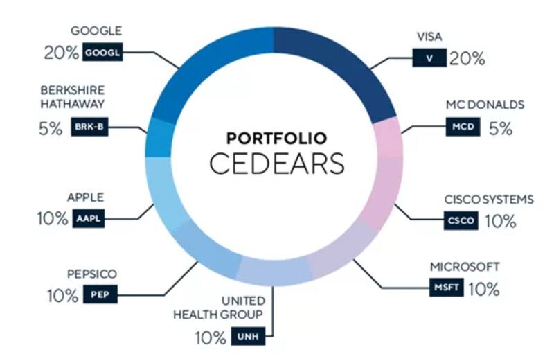 El portafolio recomendado de Cedear Criteria, mantiene un 10% de su cartera en acciones de Apple, un 10% en Microsoft, 10% en Pepsi, 10% en Cisco, 5% en McDonald's, 5% en Berkshire Hathaway, 20% en Visa y 20% en Google.