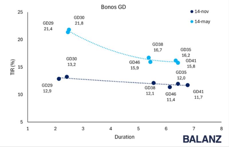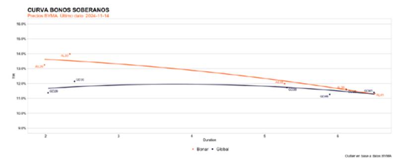 Los analistas de Grupo IEB indicaron que durante noviembre se siguió observando un aplanamiento de la curva de bonos soberanos dado que los títulos de mayor duration cómo GD35 y GD41 subieron en mayor proporción que los cortos (11% vs 8,5%).
