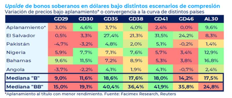 Según sus estimaciones, para converger a países con ratings CCC los bonos deberían subir entre 9% y 14%, mientras que si vamos a la mediana de bonos BB la suba potencial se encuentra entre 13% y 25%.