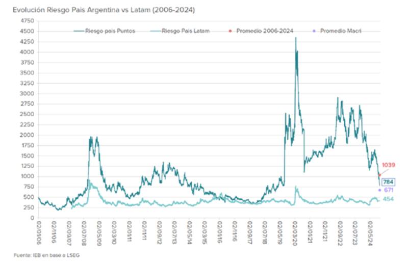 De esta manera, el indicador que mide JP Morgan se ubica en el valor más bajo de la gestión Milei y debajo del promedio observado entre 2006 y 2024.