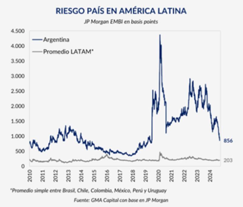 Gracias a la fuerte suba de la última semana y del último mes, en los que los títulos muestran un rally de entre 10% y 13%, el riesgo país cayó a mínimos de la gestión Milei, en 850 puntos.
