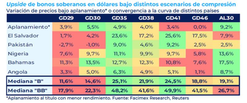 En ese sentido, agregó que "si Argentina converge a la mediana de los créditos "B", el upside en el GD35 y GD41 es del 25%; el cual se duplica al 50% si Argentina converge a la mediana de los créditos ´BB´"