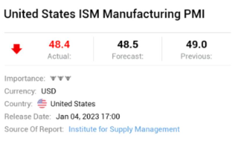 En concreto, el Institute for Supply Management (ISM) dijo el miércoles que su PMI manufacturero cayó a 48,4 el mes pasado desde 49,0 en noviembre, contrayéndose por segundo mes consecutivo.