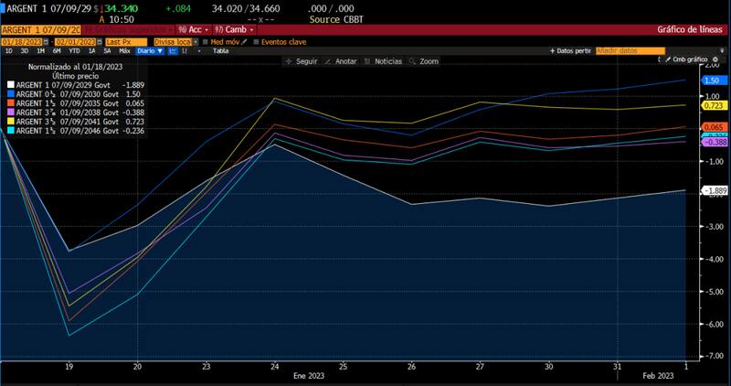 Desde entonces, se ven subas de 1,5% en el Global 2030, mientras que el resto de la deuda opera con bajas de entre 0,2% y hasta 1,9%.