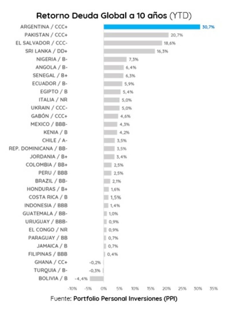 En lo que va del año, la deuda argentina subió 30,7%. Detrás de argentina le siguen los bonos de Pakistán, que ganan 20,7%, El Salvador con subas de 18,6%, Sri Lanka que gana 16,5%.