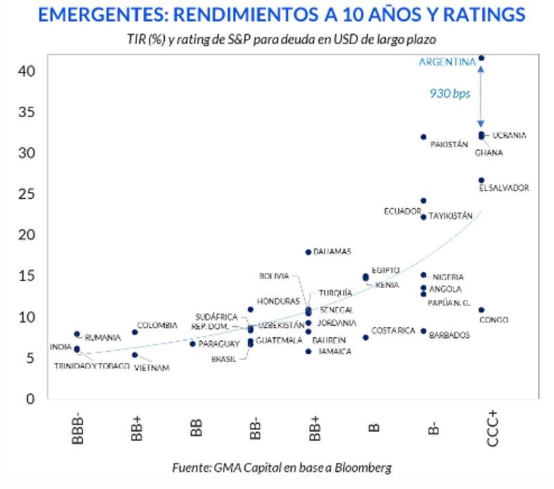 Según un análisis de Nery Persichini, head de estrategia de GMA Capital, hoy la deuda local rinde por encima del 40% y se ubica 930 puntos por encima de lo que rinde Ucrania, Ghana o Pakistán.