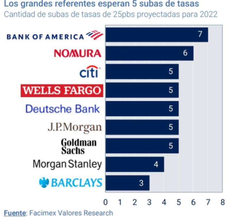 Por otro lado, Yarde Buller agregó que los principales bancos del mundo ya descuentan que habrá al menos 5 subas de tasas de 25pbs este año y algunos estiman que podría llegar a haber hasta 7 subas.
