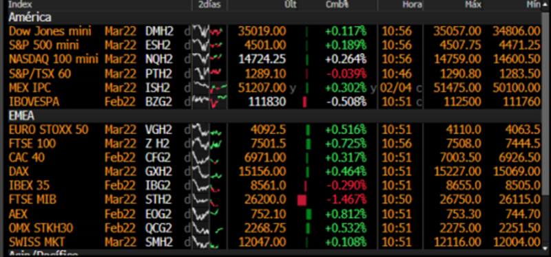 Las bolsas estadounidenses, en cambio, inician la semana con leves subas. El Dow gana 0,11%, el S&P500 sube 0,18% y el Nasdaq avanza 0,26%.