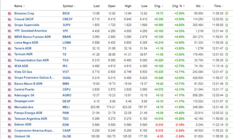 Distinto es el panorama para las acciones de las compañías argentinas en Wall Street, que operan en positivo en su mayoría. Las subas son lideradas por Bioceres que gana 5,6%, seguido por Cresud, Grupo Supervielle, YPF, BBVA y Loma Negra, todos ellos con avances de entre 5,5% y 4%.