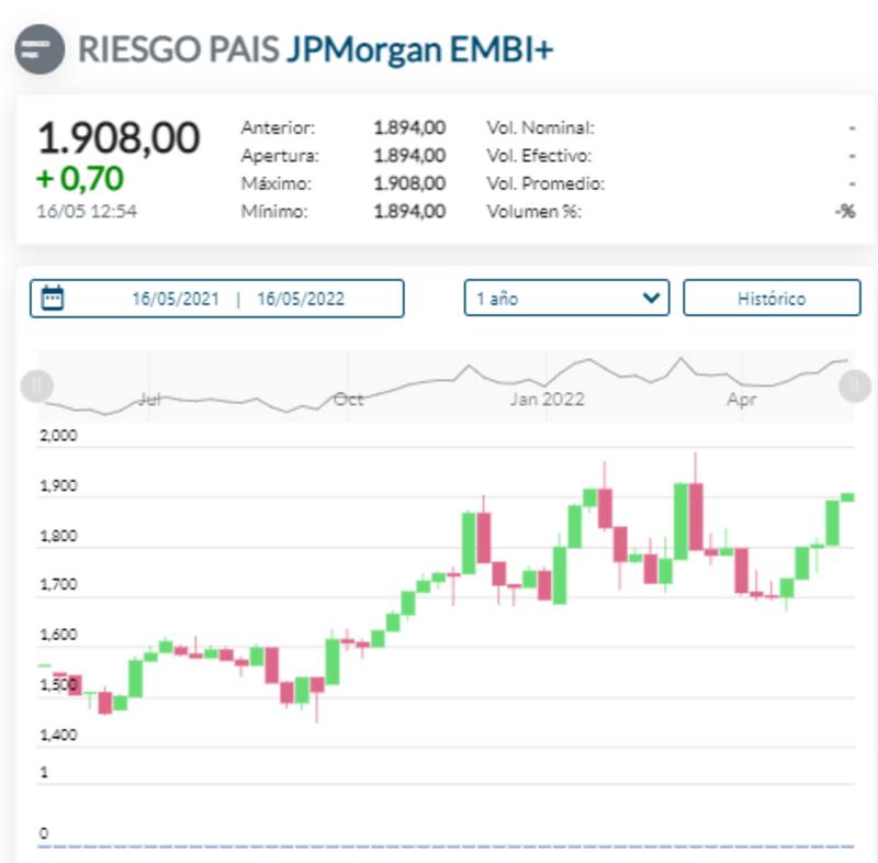 Con la caída reciente, el riesgo país se vuelve a ubicar por encima de los 1900 puntos. El indicador que mide JP Morgan se sitúa en 1908 puntos.