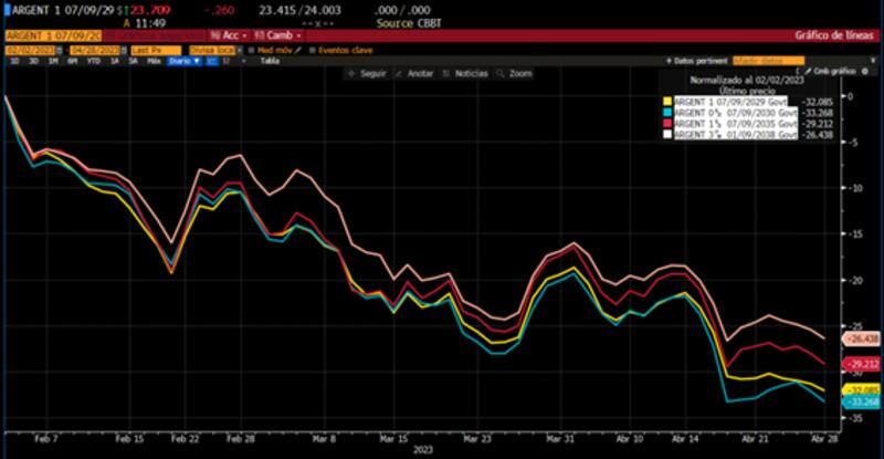 En la última semana, los bonos muestran caídas de hasta 1,7%, mientras que en el acumulado del mes de abril, los Globales van camino a cerrar el mes con pérdidas de hasta 7,6%.