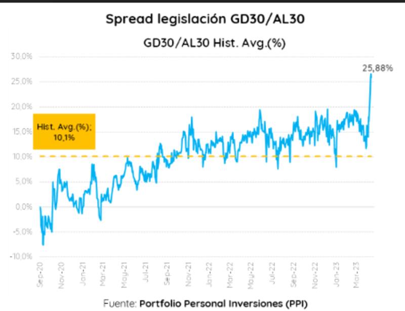 Según datos de Portfolio Personal Inversiones (PPI), el diferencial de tasas entre el Global 2030 y el Bonar 2030 había tocado el 26,6%, retrocedió hasta 25,9%.