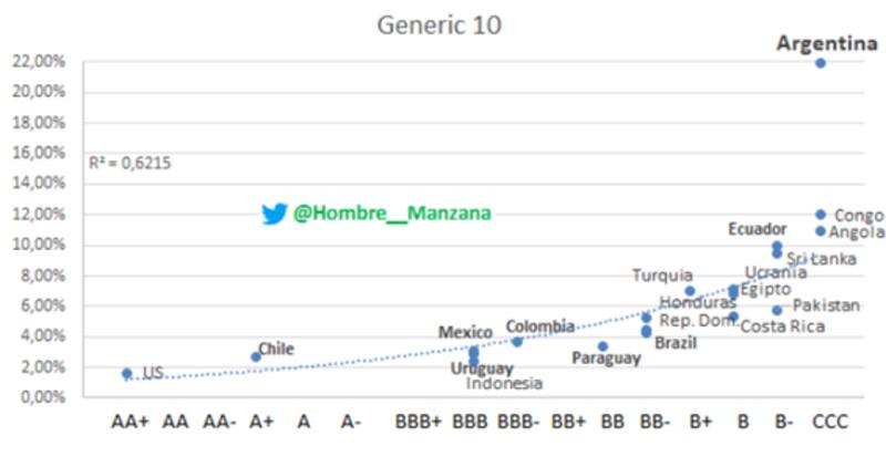 Actualmente la curva de ley local rinde 22% en el tramo más corto de la curva. De esta manera, casi que duplica los rendimientos que exhiben los países percibidos como los más riesgosos del planeta, cuyo riesgo crediticio es similar al de la Argentina.