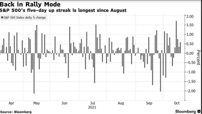 Con el avance de ayer, las acciones mostraron su quinta suba diaria consecutiva, lo cual implica la mejor racha alcista desde agosto pasado. De esta manera, los principales índices del mundo se ubican cerca de sus máximos históricos.