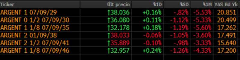 La deuda argentina sigue operando con tasas muy altas en comparación con sus pares. En el día de hoy, la deuda no muestra grandes cambios, con la parte corta de la curva subiendo apenas 0,15% mientras que el tramo medio suben hasta 0,18% y el tramo largo exhibe ganancias de hasta 0,25%.