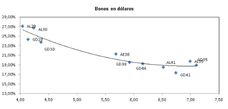 Tanto la curva de ley local como de ley internacional se encuentran con tasas por las nubes (cercanas al 27% en la ley local y del 24% en la ley NY) y con curvas seriamente invertidas en el corto plazo, lo cual advierte un escenario de estrés muy fuerte y de altísimas probabilidades de default.