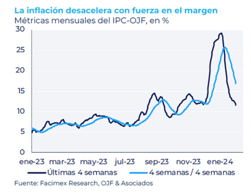 Por su parte, Adrián Yarde Buller, economista jefe de Facimex Valores, espera que la inflación mensual siga bajando en febrero, pero que en marzo vuelva a acelerar por factores estacionales.