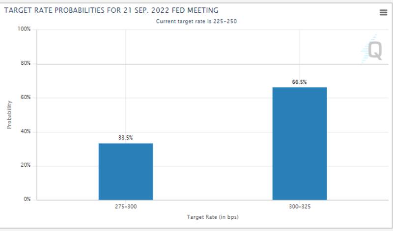 En línea con lo mencionado por los analistas de Balanz, las probabilidades de ver una suba de 75 puntos básicos en la reunión de septiembre de la Fed es de 66%.