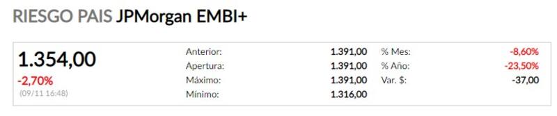 En línea con la suba de los bonos, el riesgo paístambién caía con fuerza e incluso amagó con perforar los 1300 puntos. Pero ante la desaceleración en el avance de los bonos, el índice se acomodó en 1354 puntos, 37 unidades por debajo del cierre del viernes.