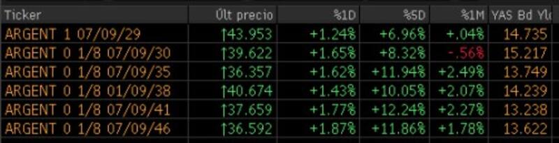 De esta manera los bonosse alejan de rendimientos del 17% que supieron tocar semanas atrás y operan con tasas que van desde el 15,3% en la parte corta hasta los 13,2% en la parte larga. Aún así, la curva se muestra fuertemente desplazada al alza e invertida, evidenciando desconfianza que hay en el mercado sobre la deuda argentina.