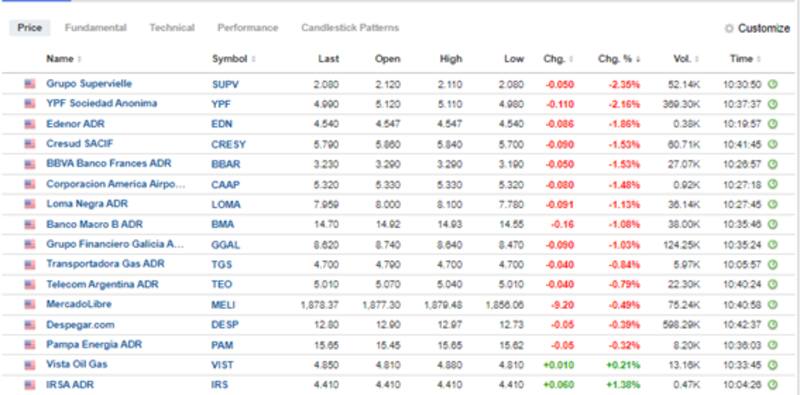Las acciones Argentina en Wall Street operan mayormente en negativo. Las bajas son lideradas por Grupo Supervielle que xae 2,35%, seguido por YPF que retrocede 2,1% y Edenor que cae 1,8%