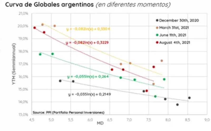 Pedro Siaba Serrate, estratega de Portfolio Personal Inversiones, destacó que la negatividad dentro de la curva soberana se redujo ligeramente desde fin de julio, y ahora está en el mismo nivel que a fines de marzo.