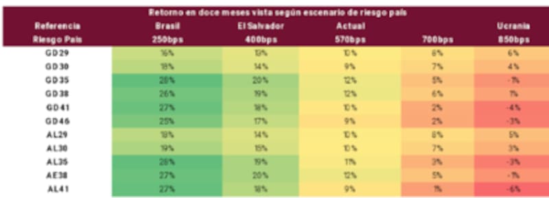 "Los bonos del tramo largo son los de mayor potencial. En particular, destacamos a los bonos GD35 (paridad 71%, TIR 10,0%) y GD38 (paridad 75%, TIR 10,1%). En un escenario donde el riesgo país cae a 400 pb, estos podrían ofrecer ganancias de hasta 20% en los próximos 12 meses. En tanto, si el riesgo país se mantiene estable, ofrecerían ganancias de 12% debido a la caída en el nivel global de tasas. Optamos por bonos Ley Nueva York, ya que los spreads legislativos se encuentran en niveles bajos", remarcaron.