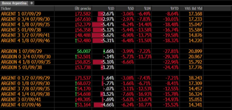 La dinámica de los bonos soberanos argentinos experimenta un giro abrupto a la baja durante la jornada y revirtieron completamente el rebote inicial.