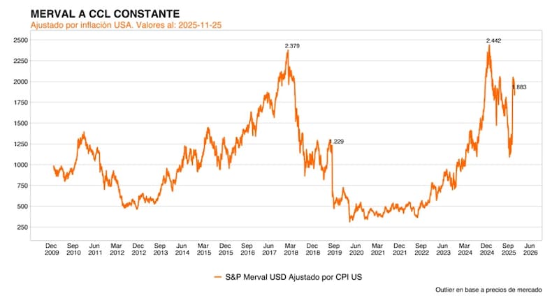 El S&P Merval en dólares subió 41% desde las elecciones, pasando de u$s 1325 a u$s 1860, en lo que va de noviembre, el índice baja 6,5% en dólares.