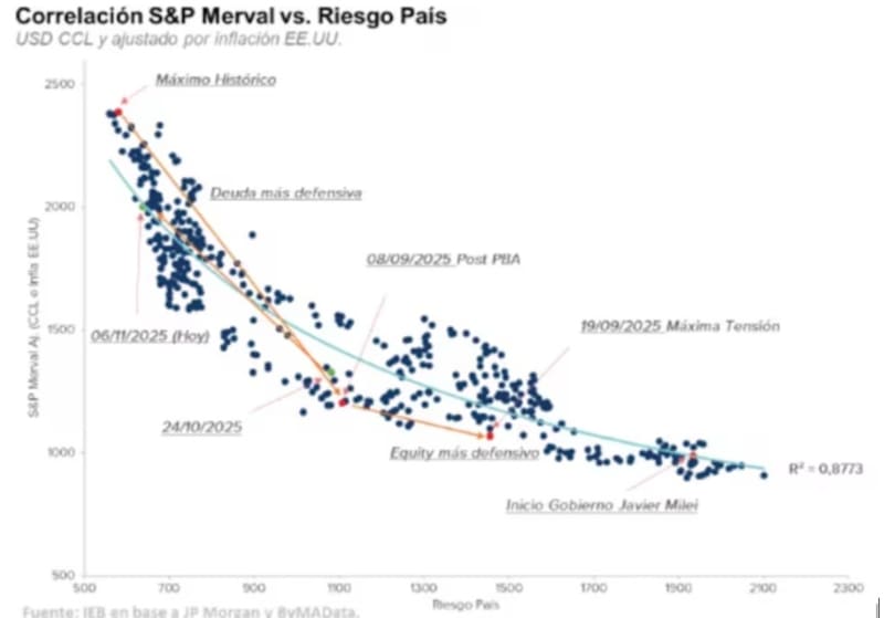 “Si analizamos la relación entre S&P Merval y riesgo país (especialmente si acortamos el período de análisis a los últimos 3 años), podemos observar que los valores actuales de EMBI se condicen con un Merval de aproximadamente u$s 1950. De esta manera, entendemos que gran parte del gap que presentaban los bonos en relación al equity se ha ido cerrando”, comentó Vlassich.