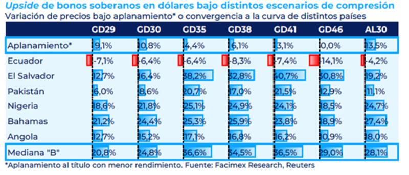 Según sus estimaciones, para que la deuda argentina opere con tasas similares a los que operan los bonos con calificación "B", los bonos del tramo corto podrían subir entre 21% y 25%, los títulos del tramo medio podrían avanzar 35% en promedio y la renta fija de mayor plazo podría ganar entre 30% y 37% desde los valores actuales.