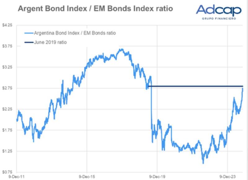 "Los bonos soberanos están llegando a un nivel de optimismo similar al de Junio 2019, donde había una normalización de la economía (déficit fiscal bajando, inflación bajando, dólar estable) pero a expensas de pagar un costo político que podía poner en riesgo las elecciones de 2019", indicaron.