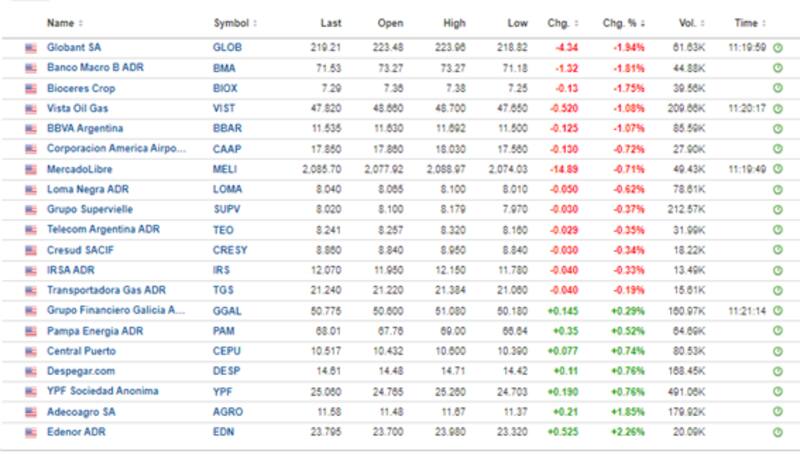 La mayor debilidad se da en Globant, con una merma de 1,9%, seguida por Banco Macro, Bioceres, Vista y BBVA Argentina, cayendo entre 1% y 1,8% el martes.