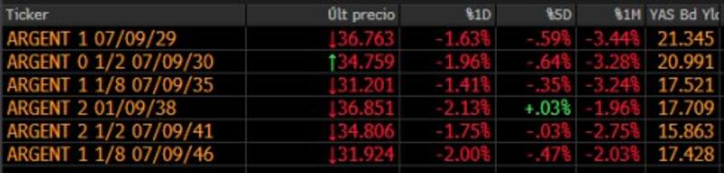 Desde entonces, los bonos acumulan pérdidas superiores al 8% en promedio y ya exhiben rendimientos de hasta 21%. Las pérdidas incluso ascienden al 13% si se comparan los precios actuales respecto de los que alcanzaron tras el rally del lunes posterior a dichos comicios.