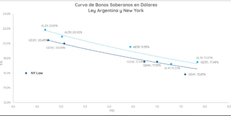 De esta manera, los bonos siguen sin mostrar una recuperación significativa y se mantienen en zona de mínimos. Las paridades se encuentran debajo del 38% en todos los tramos de la curva y los rendimientos se ubica en niveles de 21% en el tramo corto y de 17% en el tramo largo, lo que refleja la desconfianza de los inversores para con la deuda y los compromisos de pago de la Argentina.