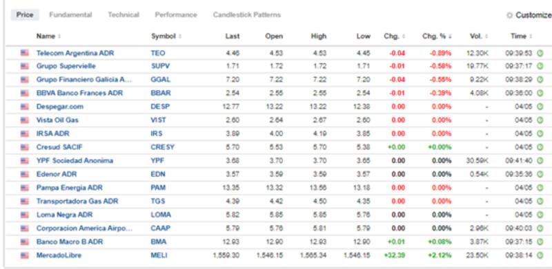 Pese a ello, las principales acciones argentinas en Wall Street opera sin grandes cambios. Se destacan las acciones de MercadoLibre que suben 2%. Por el lado de las pérdidas, las acciones de Telecom caen 0,8% y Grupo Supervielle retrocede 0,56%.