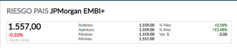 En línea con la debilidad de mediano plazo de los bonos, el riesgo país permanece cercano a la zona de 1600 unidades e inicia el miércoles en niveles de 1557 puntos básicos, avanzando un 46% desde el piso alcanzado tras el canje de deuda en septiembre pasado.