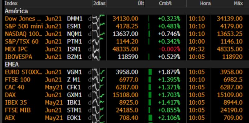 En Europa, los índices también operan con ganancias. El Stoxx600 gana 1,8% seguido por el Dax alemán, que gana 1,7%. El Ibex35 de España también sube tras la victoria de las elecciones de Madrid de la mano del Partido Popular que obtuvo 65 bancas y quedó a un paso de la mayoría absoluta.
