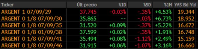 En la parte corta de la curva, el Global 2029 opera con una leve desmejora mientras el Global 2030 se muestra sin cambios. En el tramo medio, en tanto, se observan ligeras subas de 0,09% y de 0,02% para los Globales 2035 y 2038, mientras que en el extremo más largo, los bonos a 2041 y a 2046 apenas trepan 0,08% y 0,06% respectivamente.