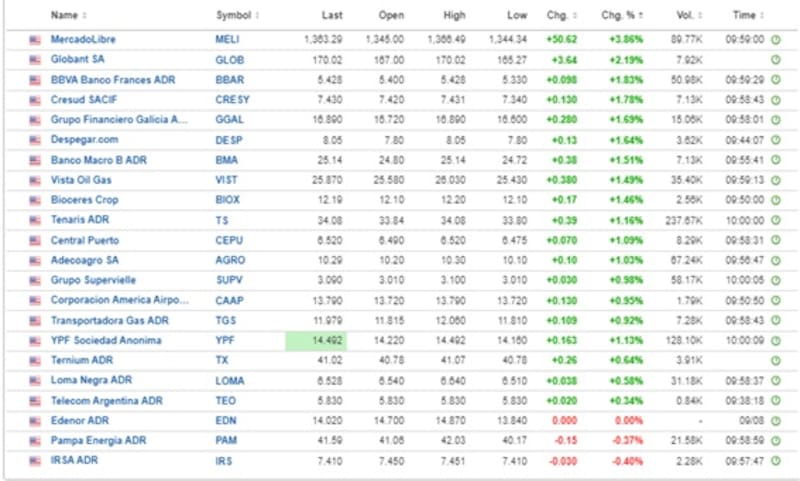 Las acciones de BBVA Argentina, Cresud, Grupo Financiero Galicia, Despegar, Banco Macro, Vista, Bioceres, Tenaris, Ventral Piuerto y AdecoAgro también operan con ganancias de entre 1% y 1,8%.